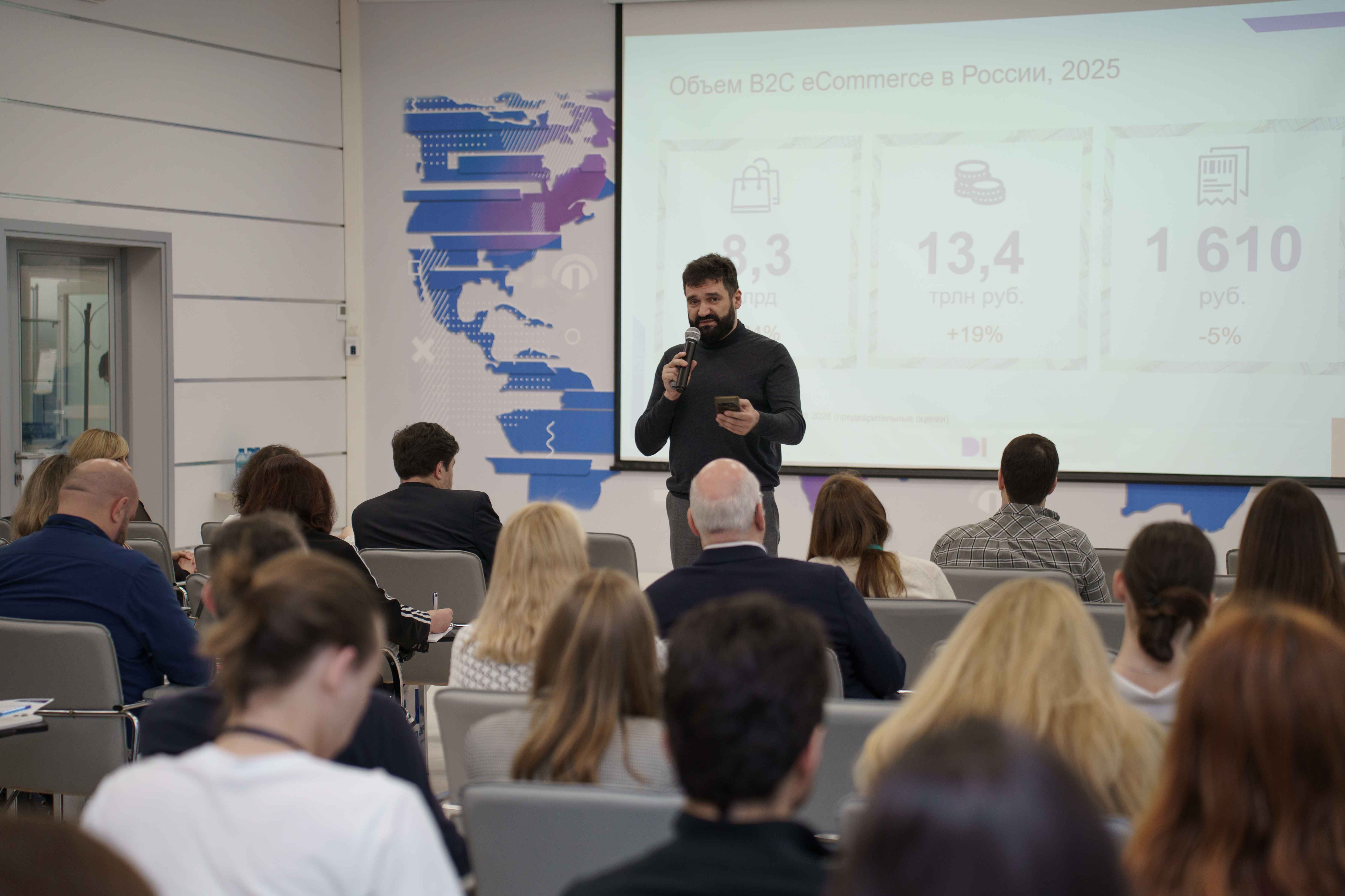 Первый спикер Федор Вирин, сооснователь и партнер исследовательского агентства Data Insight, начал с неожиданного тезиса: больше нет отдельно электронной торговли и отдельно ритейла. Есть онлайн-ритейл, внутри которого остается офлайн-канал. В 2025 году онлайн-продажи превысили 50% во всех категориях, кроме продуктов питания и фармы. Электроника – уже 65% в онлайне. При этом количество заказов достигло 8,3 млрд, а средний чек упал до 1610 рублей. Почему? Потому что люди делают десятки микрозаказов: зубная паста отдельно, салфетки отдельно.